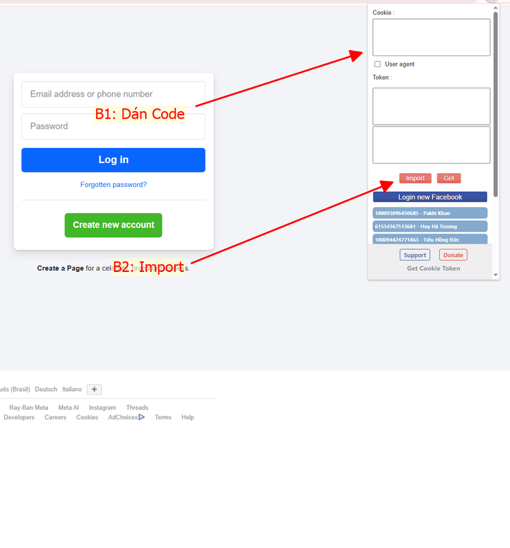 Mở Extention Get Token Cookie , nhập Code 2 vào ô COOKIE sau đó nhấn IMPORT